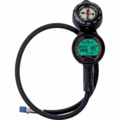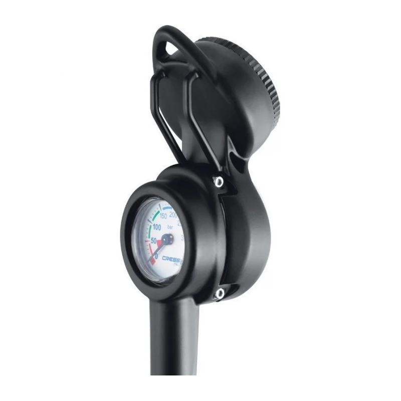 Manomètre aux dimensions restreintes et d’un poids réduit. Il a été spécialement étudié pour éviter les sollicitations excessives sur le flexible HP qui est relié au premier étage du détendeur. L’instrument possède un boîtier métallique en laiton chromé qui le rend particulièrement robuste. Le verre est réalisé de manière à servir aussi de soupape de surpression. En cas d’augmentation inopinée de la pression à l’intérieur du boîtier, le verre se lève légèrement pour laisser s’échapper l’excès de pression. Le cadran luminescent est gradué jusqu’à 350 bars dans la version métrique et à 5000 psi dans la version anglo-saxonne. Une zone rouge indique les 50 bars tandis qu’une zone verte couvre la pression entre 50 et 200 bars. Une zone bleue commence à 200 bars et se termine à la fin de la graduation. L’instrument est inséré dans une petite console de forme moderne, réalisée en polycarbonate et desmopan. Ces matières assurent une bonne protection contre les chocs et les griffures et sont en même temps très légères. À l’extrémité de la console se trouve un oeillet pour fixer l’instrument au gilet. On évite ainsi qu’il pende et qu’il risque de s’emmêler et d’endommager l’environnement.