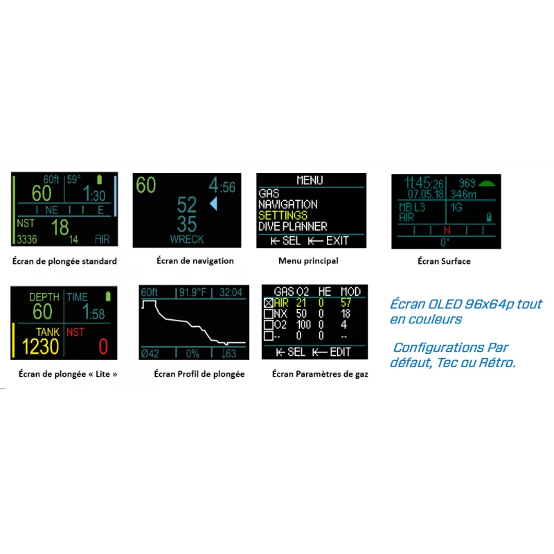 • Jusqu’à 8 gaz sélectionnables en mode Plongée, ainsi que 8 diluants et 2 set points pour la plongée en mode CCR.