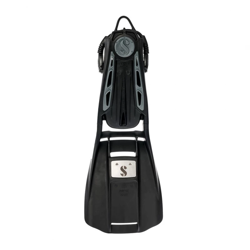 - Les palmes complètes sont disponibles en noir en 5 tailles (XS, S, M avec des voilures Midi ; L, XL avec des voilures Maxi) et comprennent un multi-outil et 2 jeux de plaques de blocage, un système de lestage en acier inoxydable et un sac « Boat Bag » SCUBAPRO.